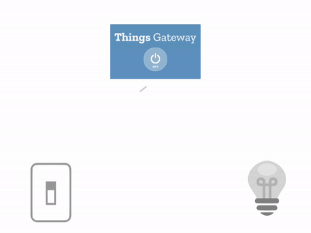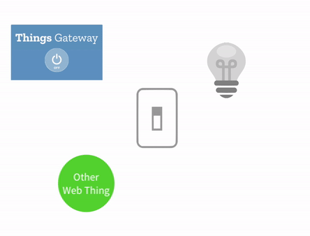 The following image represents the current polling method used by the Things Gateway. In this image, a Rule is set to turn the light on when the switch turns on, and turn the light off when the switch turns off. The gray dotted lines represent an HTTP request; the yellow dotted lines represent an HTTP response.