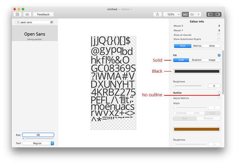 There are many tools available for converting TrueType and OpenType fonts on the BMFont format. The Moddable team often uses Glyph Designer (macOS). Another good options is the fontbm command line tool by Vladimir Gamalyan. Instructions for using both are provided below.