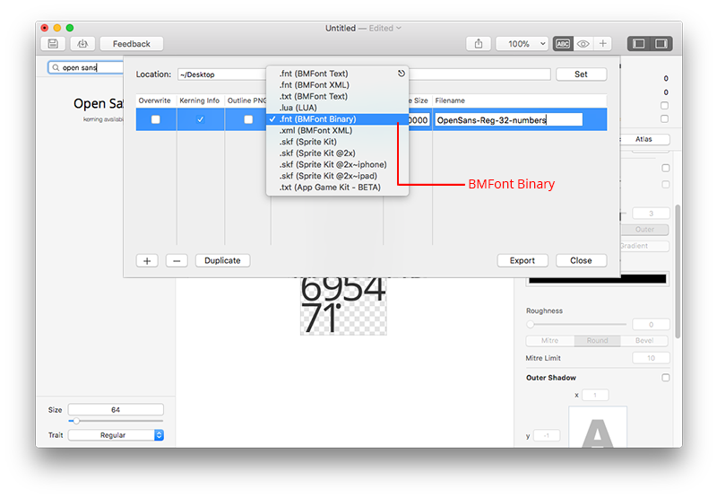 Export .png glyph and .fnt font metrics files in the BMFont Binary format.