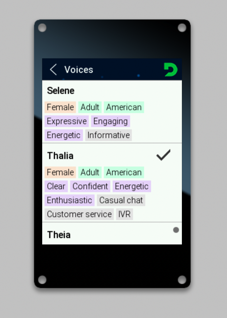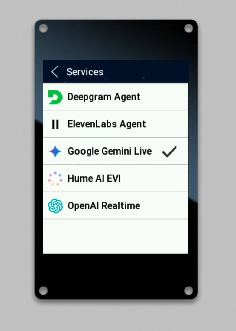 The conversationalAI a comprehensive interactive voice chat app. It uses integrates support for all the key hardware features of Moddable Six include the touch screen, speaker, microphone, and Wi-Fi. It works with major AI and voice services including OpenAI, Google Gemini, Anthropic Claude, ElevenLabs, Deepseek, and Hume.
