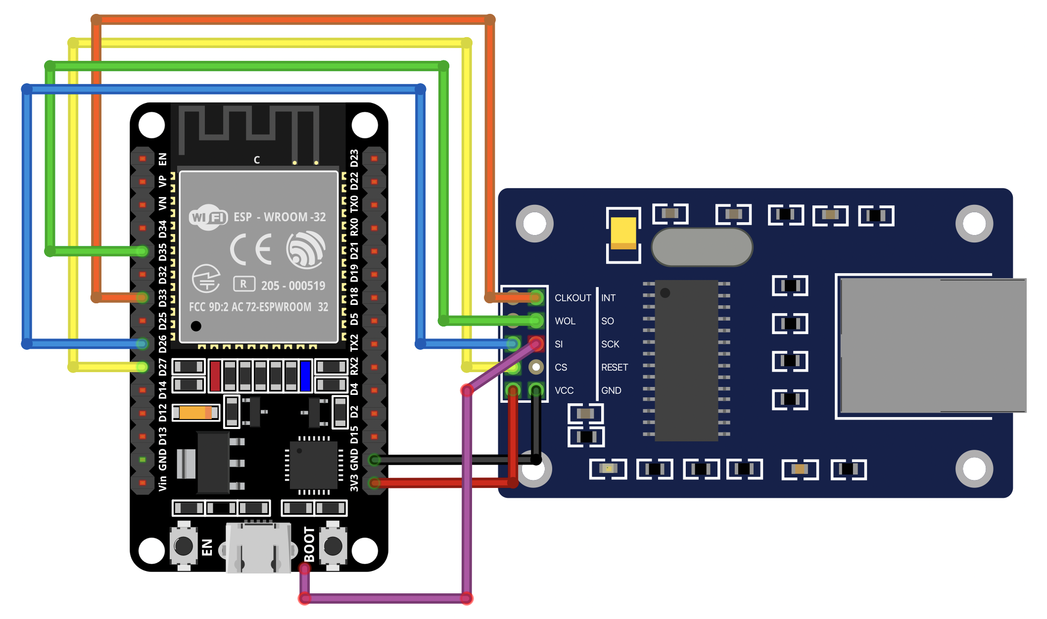 The diagram below shows a Moddable Two (an ESP32-based hardware module) wired to a HanRun ENC28J60 module.